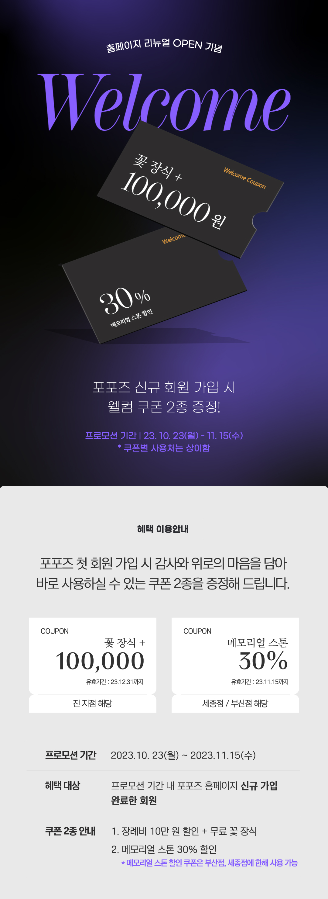 - ・ 메모리얼 스톤 30% 할인 쿠폰은 포포즈의 장례 패키지 이용 후 추가 시 단독 적용됩니다.